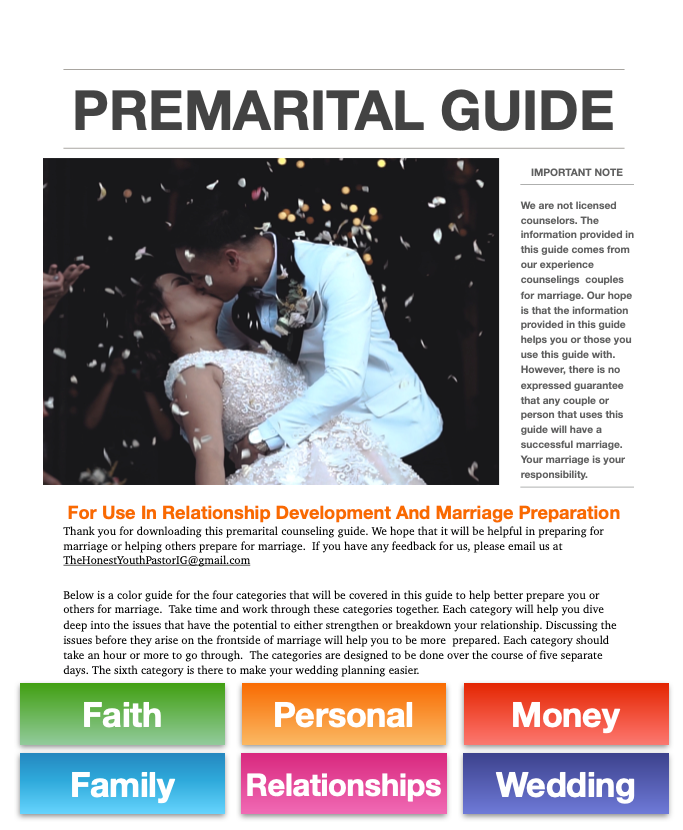 It is important to remember that we are not licensed counselors. The information provided in this guide comes from our experience of helping couples prepare for marriage. Our hope is that the information provided in this guide helps you or those you use this guide with. However, there is no expressed guarantee that any couple or person that uses this guide will have a successful marriage. Your marriage is your responsibility.