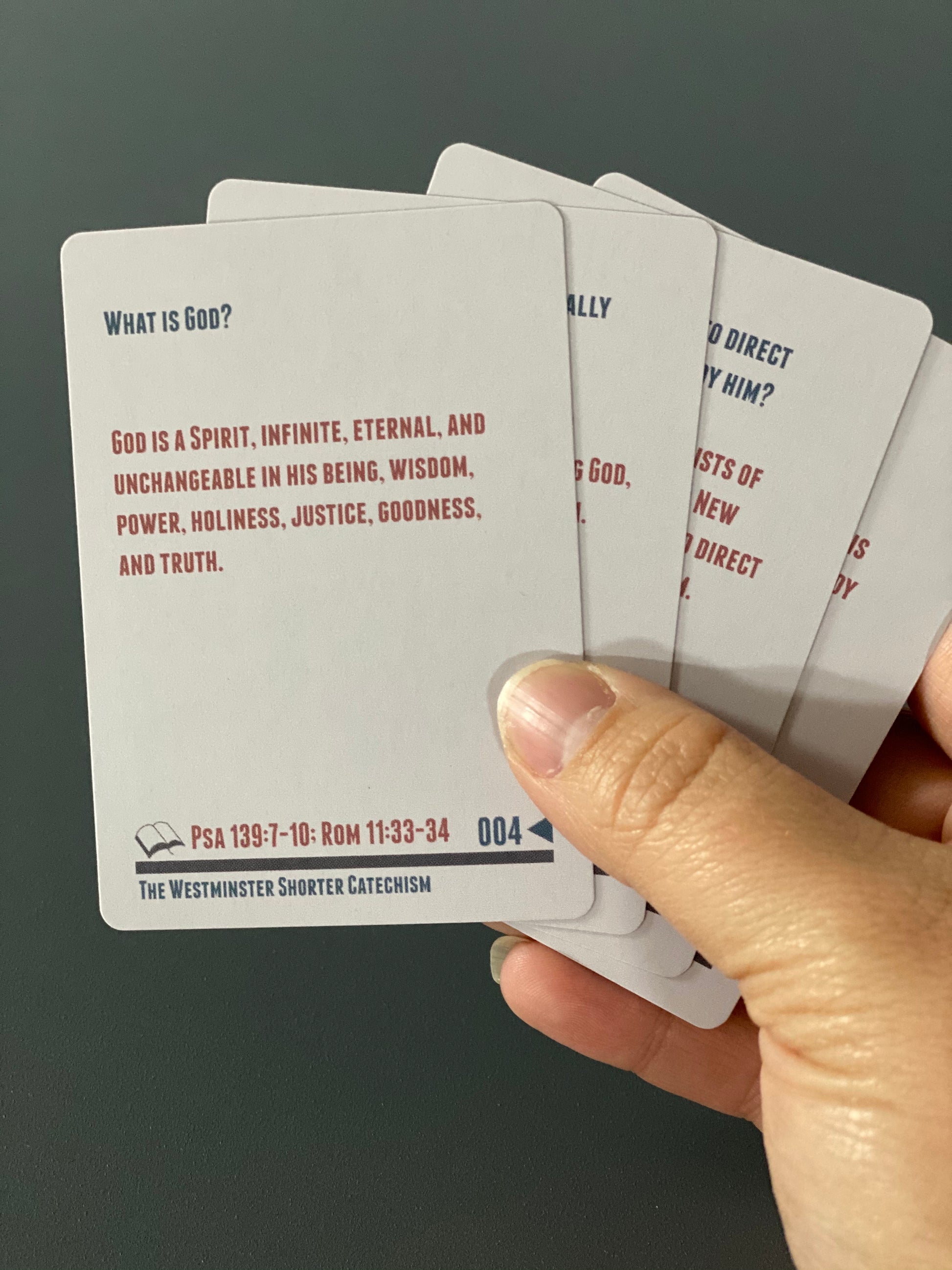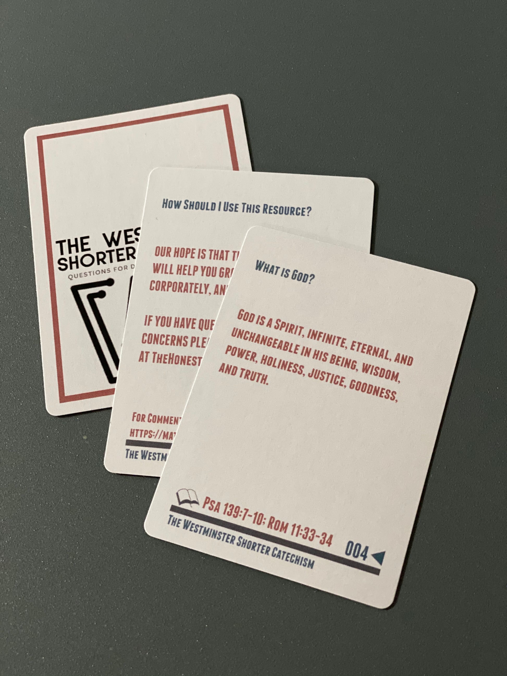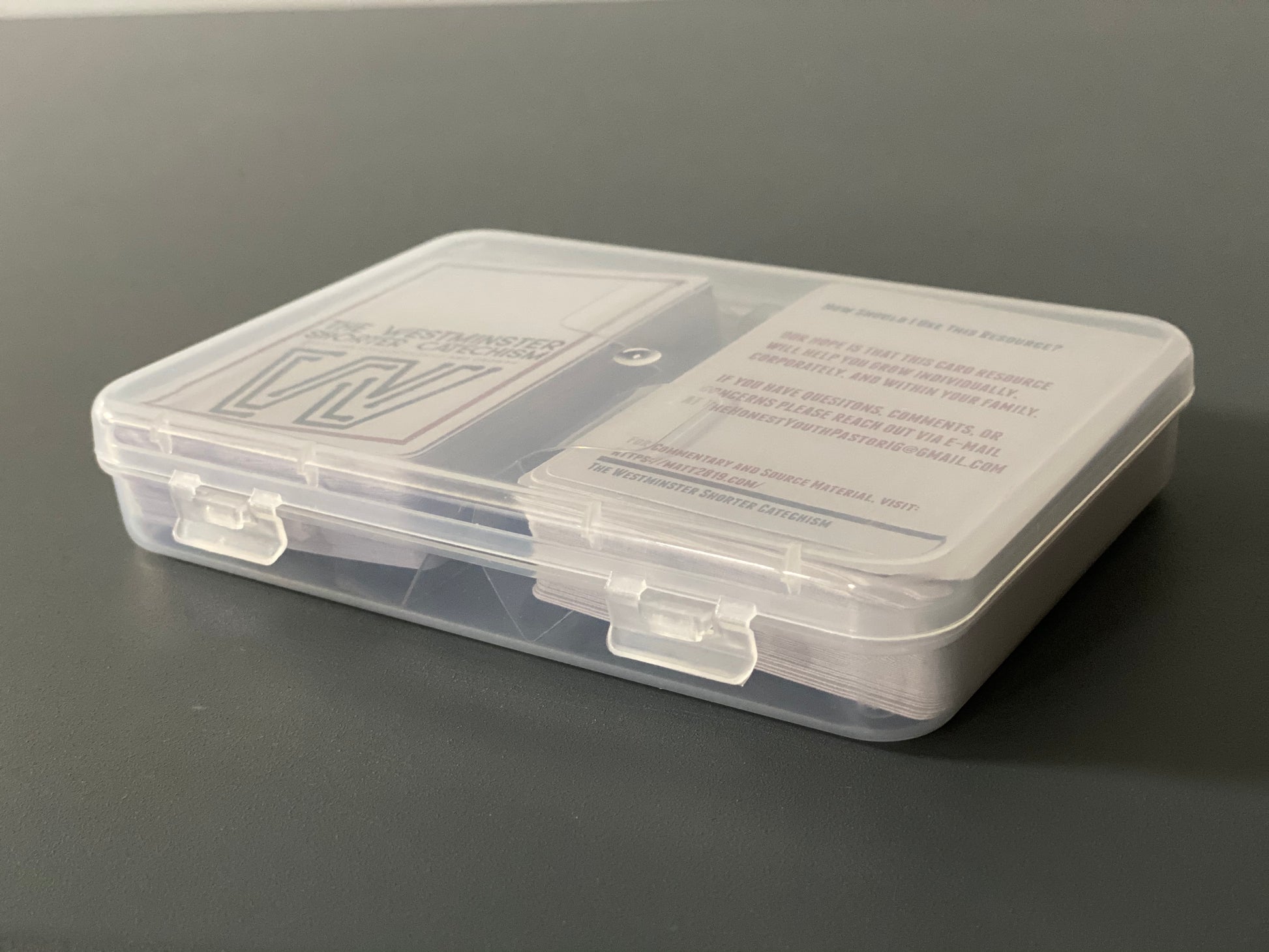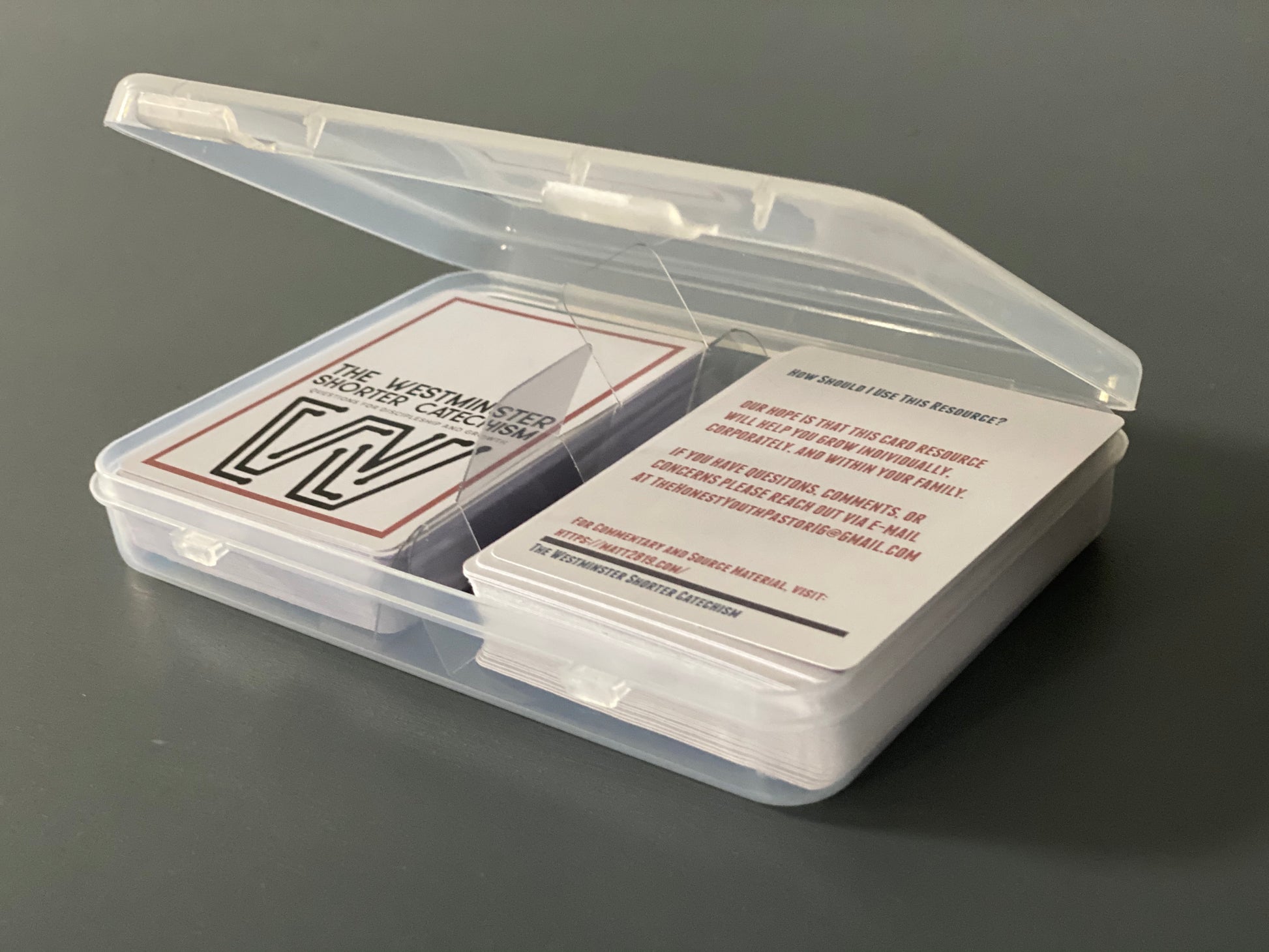 The Westminster Shorter Catechism deck is designed for small groups, youth groups, discipleship classes, and your family. Our hope is that this resource will help you be anchored in scripture. The card deck includes 108 cards (including an instruction card) and will arrive in a clear plastic case for safekeeping.